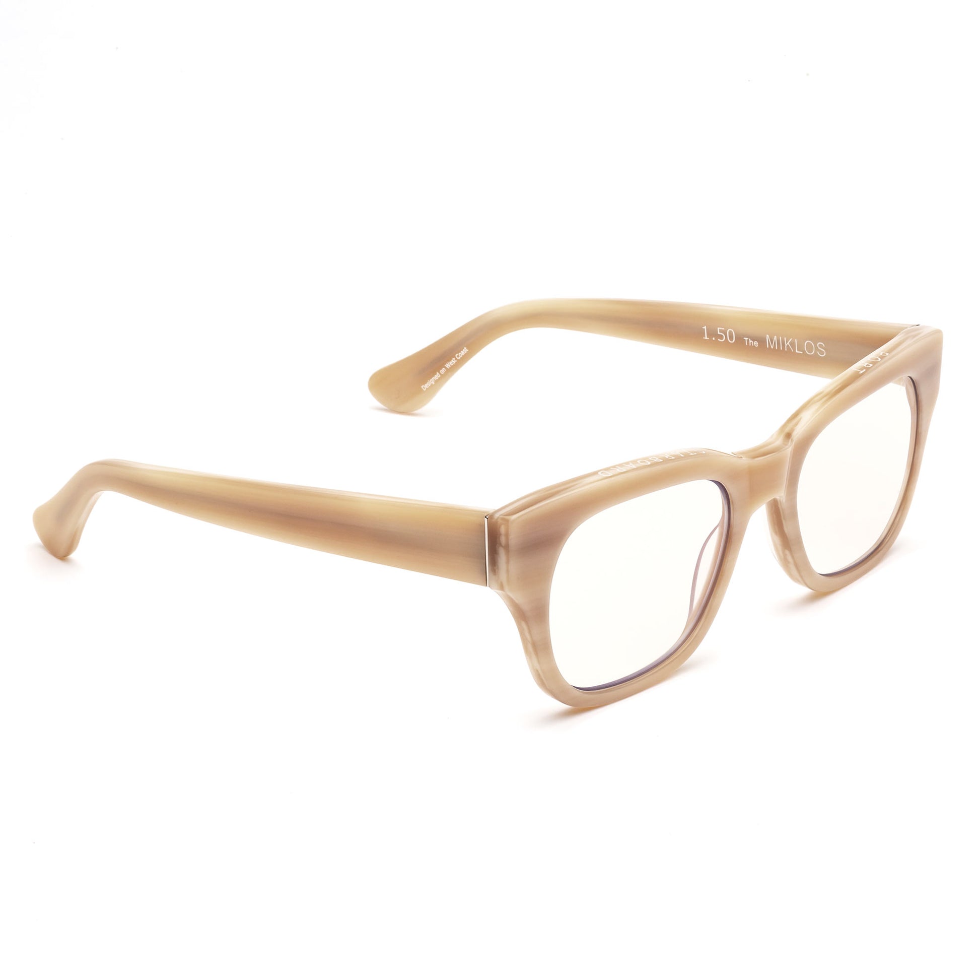 Our bestselling style. It’s like the elastic waist pant of eyewear…which is degrading to Miklos, but it fits that wide a range. People with larger faces like the frame’s thickness and solid feel. Customers with smaller faces like wearing a frame that stands out. Just depends on what you’re into. We’ve taken the liberty of engraving “Port” over the left eye, and “Starboard” over the right eye. It’s a boat thing. Not a yacht thing.